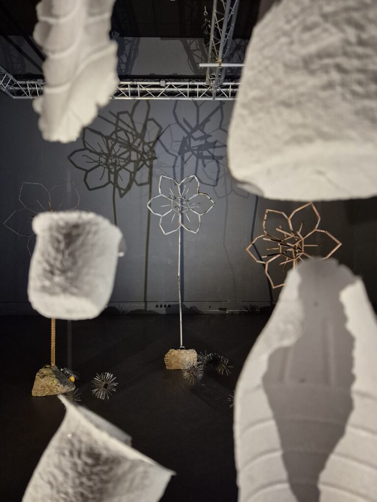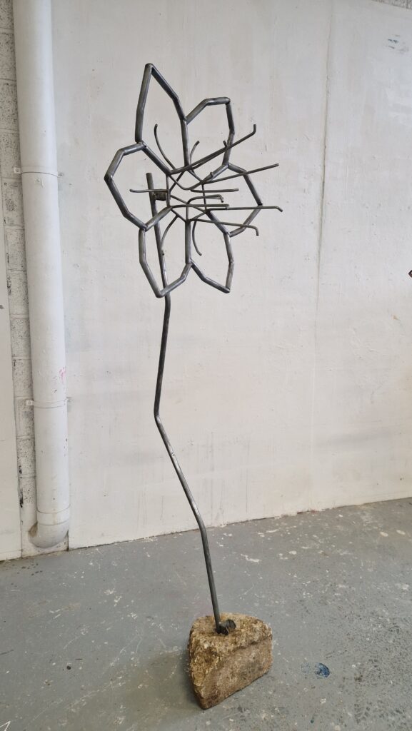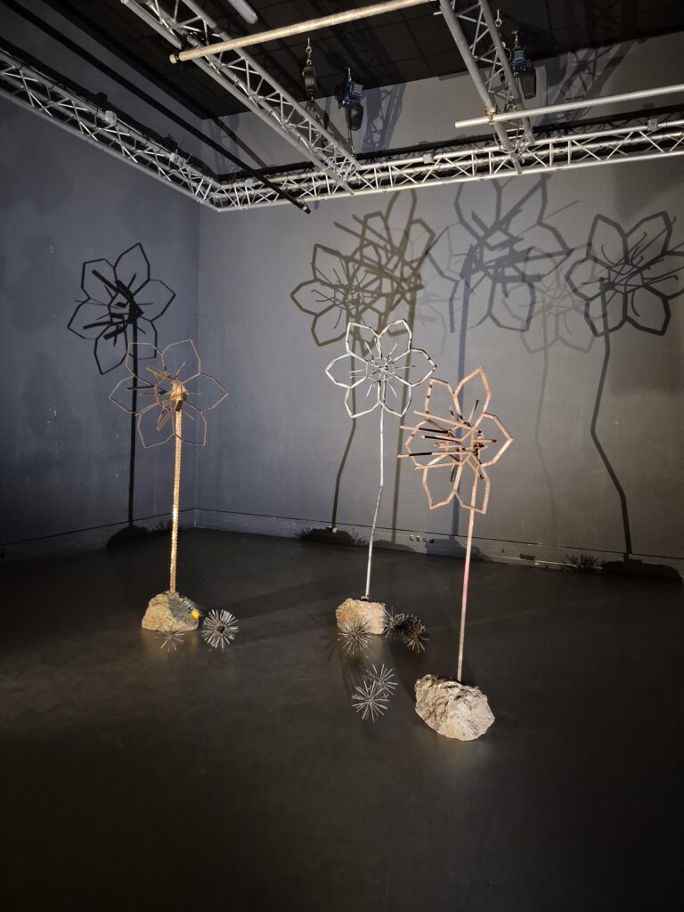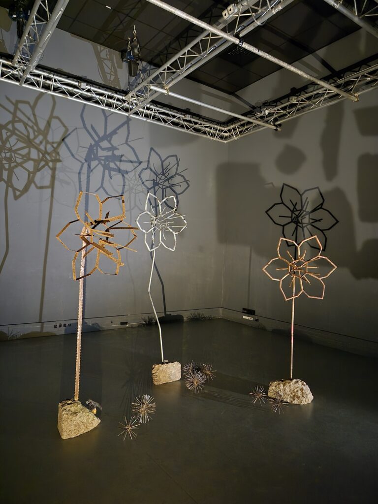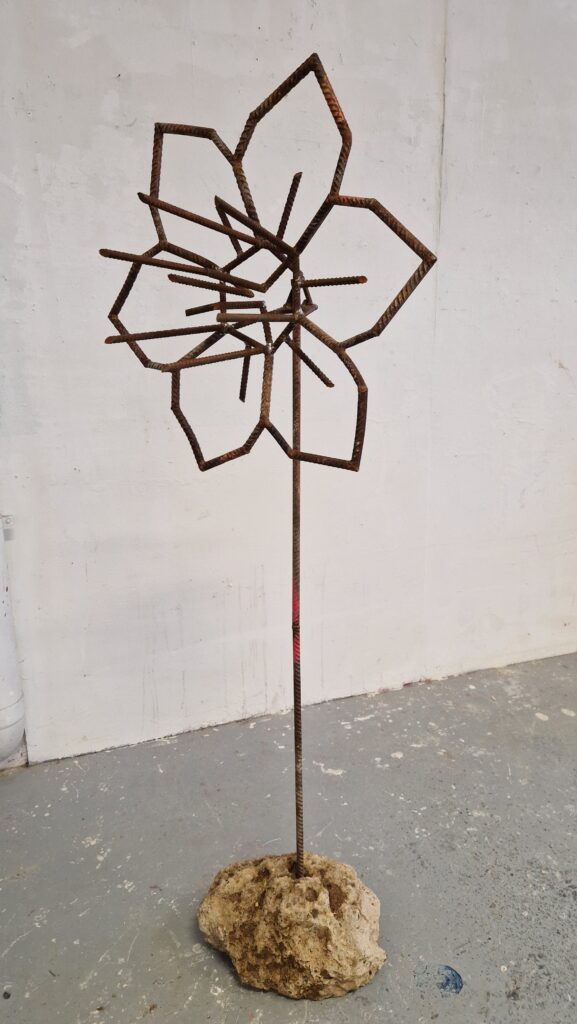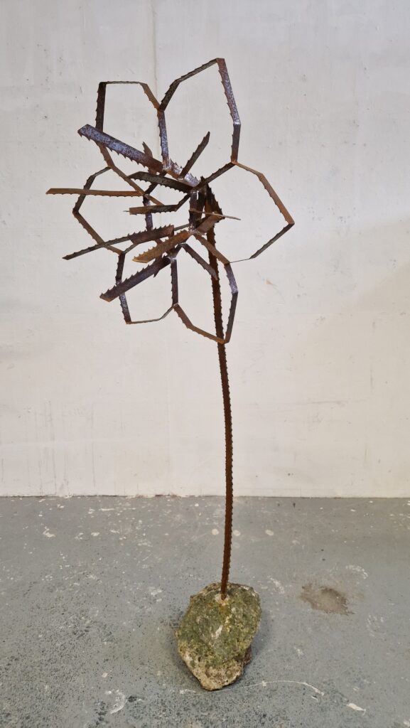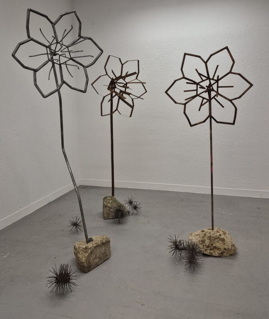 Narcisses, 2024, fleurs faites en métal récupéré : lames de scie à ruban, éléments galvanisés de décoration de palissades, fers à béton et socles en béton de récupération. Les sculptures mesurent entre 180 et 200 cm de hauteur, 80 cm de diamètre en tête et 40 à 50 cm en pied.