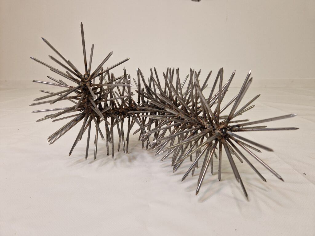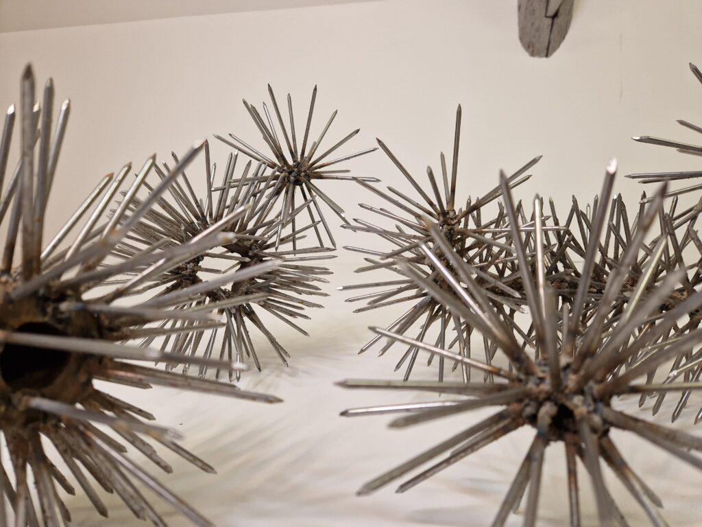 Etincelles, 2024, clous soudés sur des objets en acier récupérés, les pièces mesurent entre 20 et 40 cm, présenté au sol.
