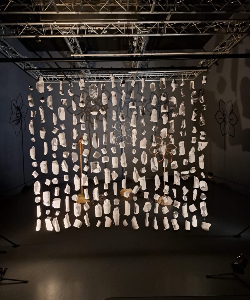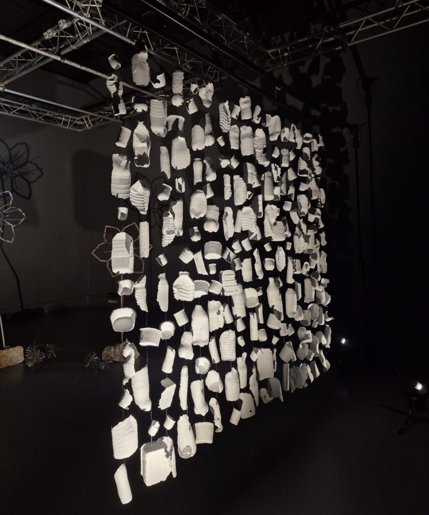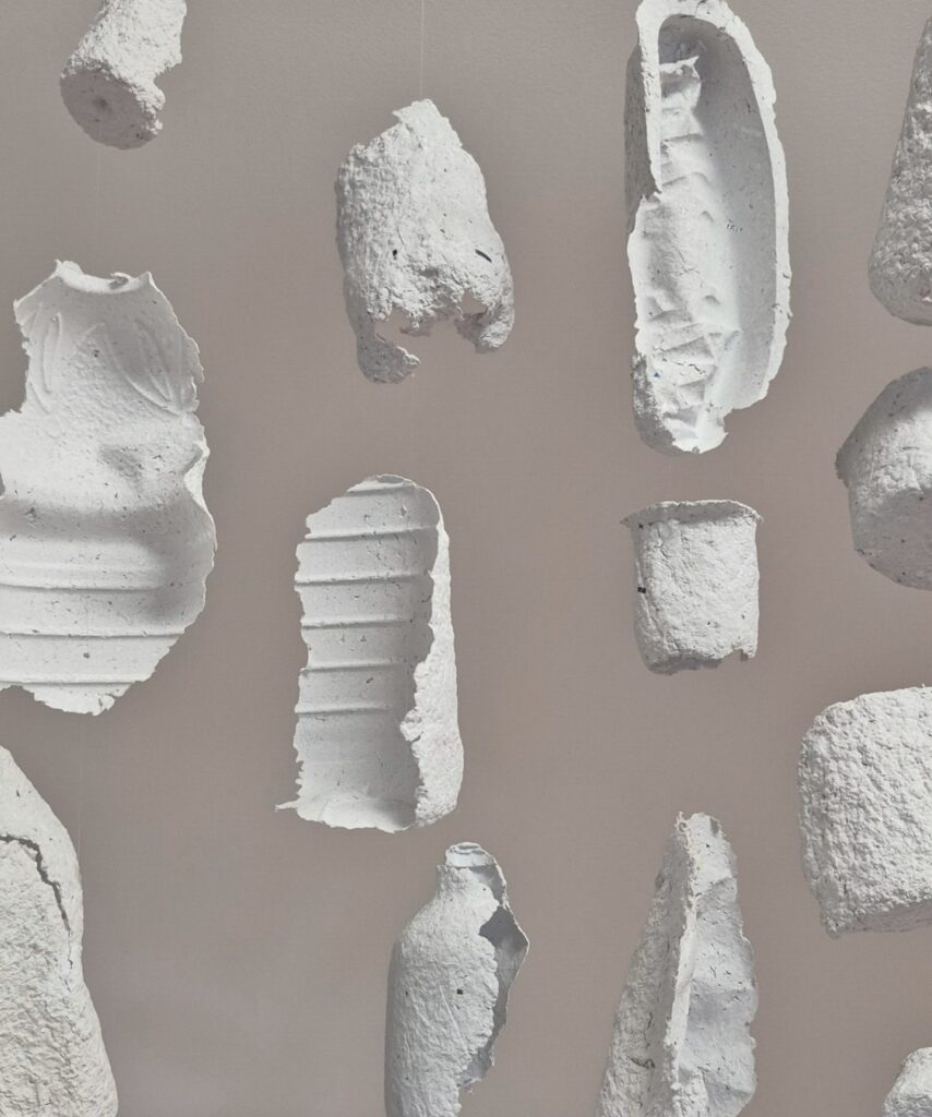 Empreintes, 2024, moulages d’emballages alimentaires en pâte à papier recyclé, chaque pièce mesure entre 5 et 35 cm. L’installation est une tenture constituée de 18 suspensions, chacune d’une dizaine de moulages reliés entre eux par un fil de nylon.