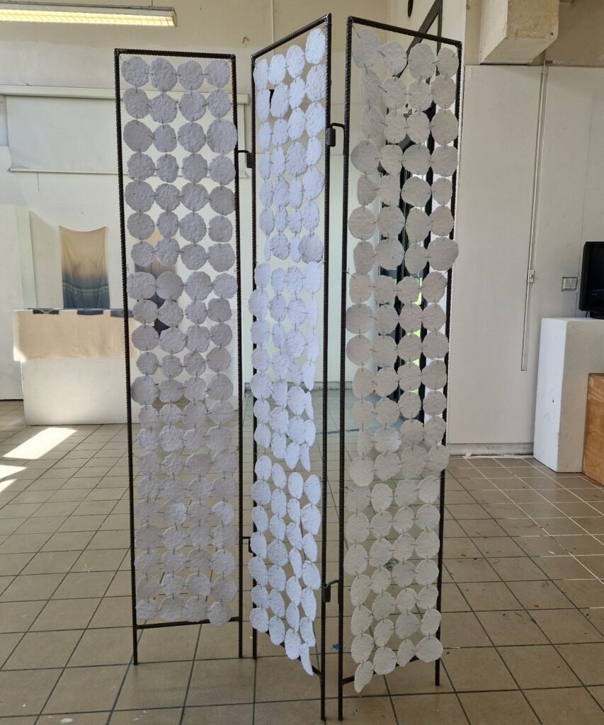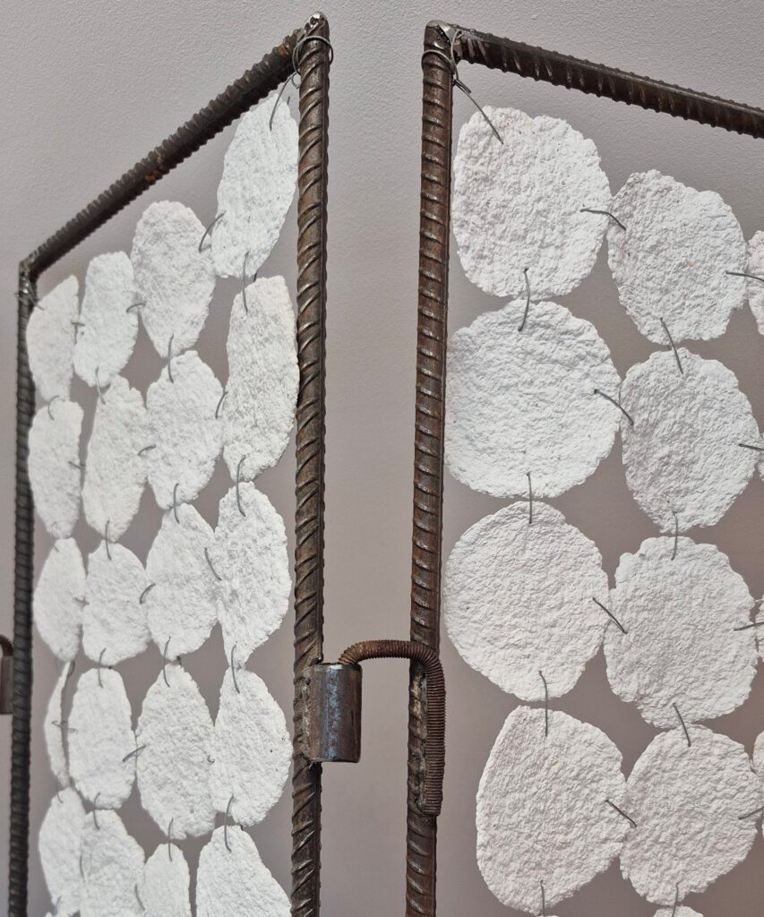 Paravent, 2024, assemblage de pièces en papier recyclé façonnées en ronds, accrochées sur un châssis en fer à béton et objets récupérés soudés, 190 × 115 cm.