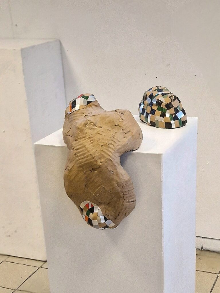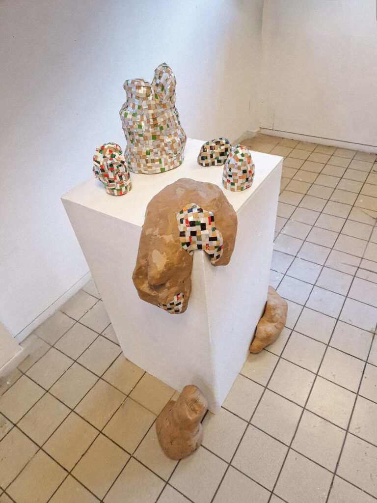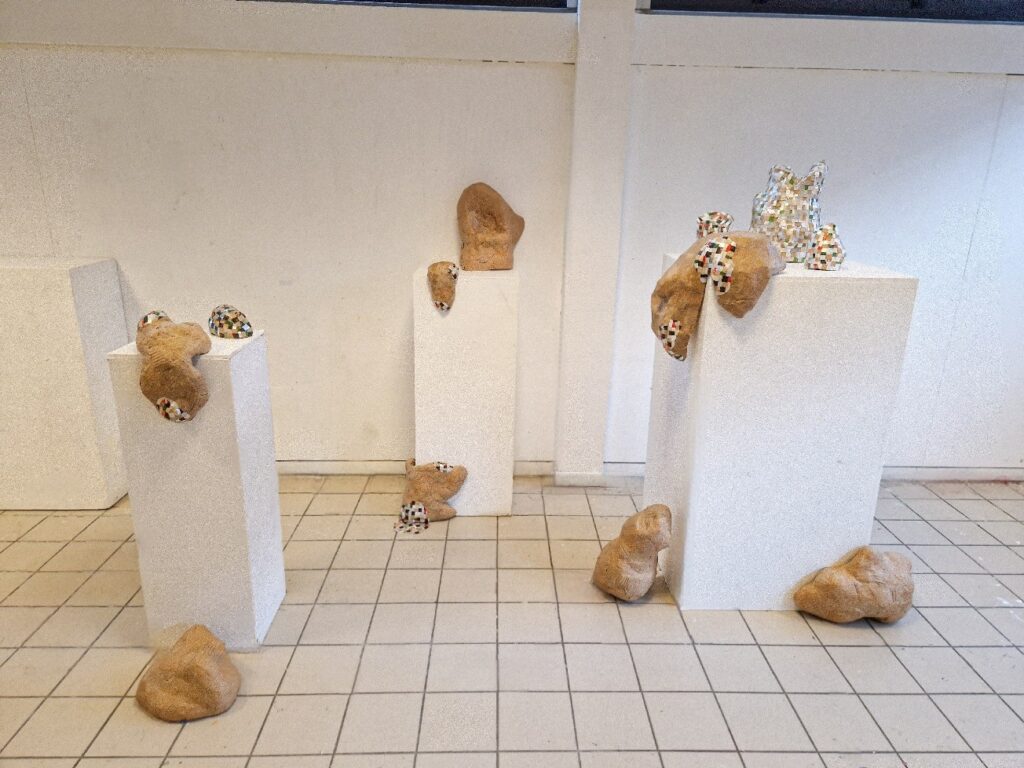 Contamination, 2023, sculptures en carton, fragments de déchets recyclés collés, les pièces mesurent entre 10 et 50 cm.