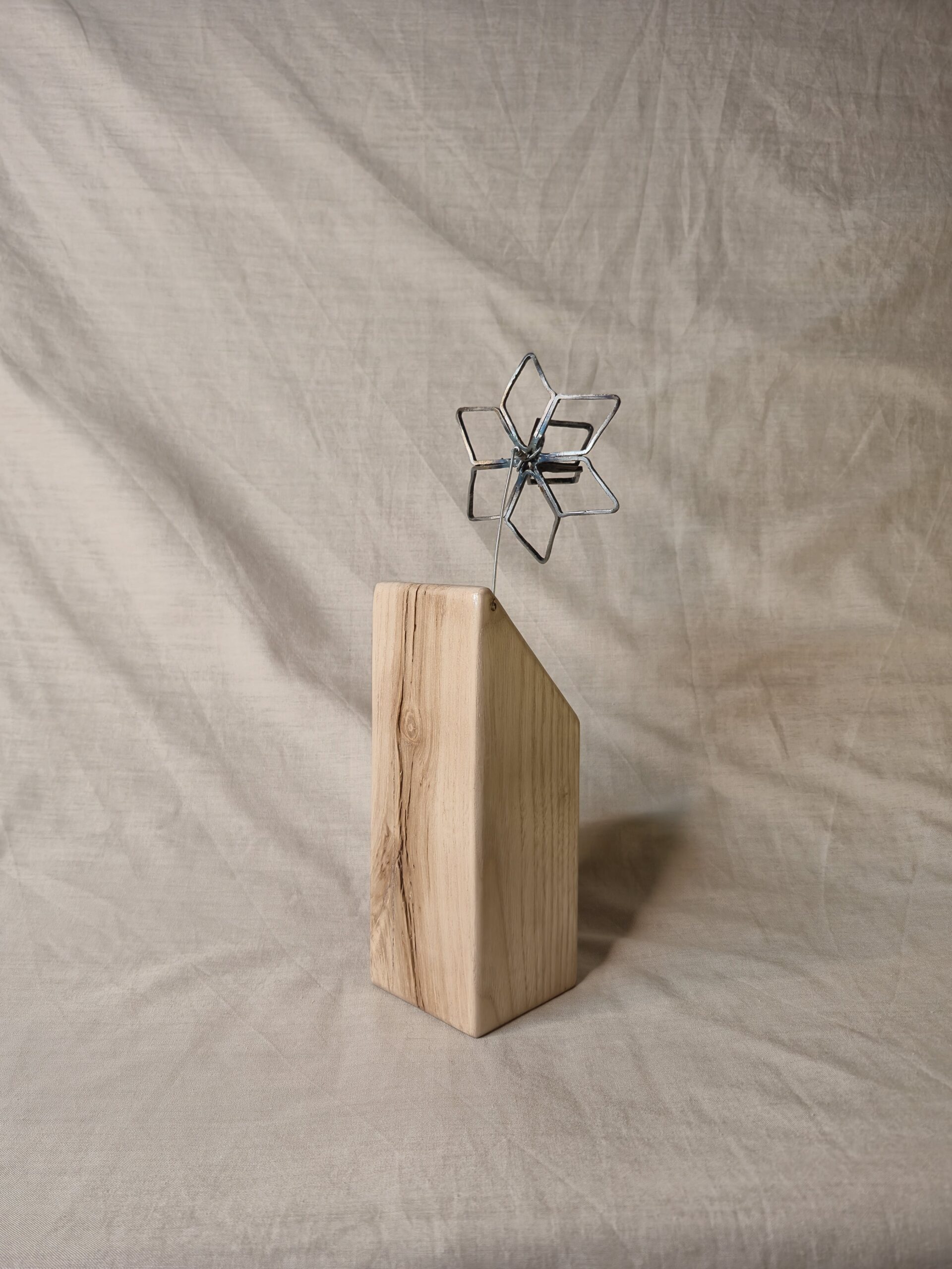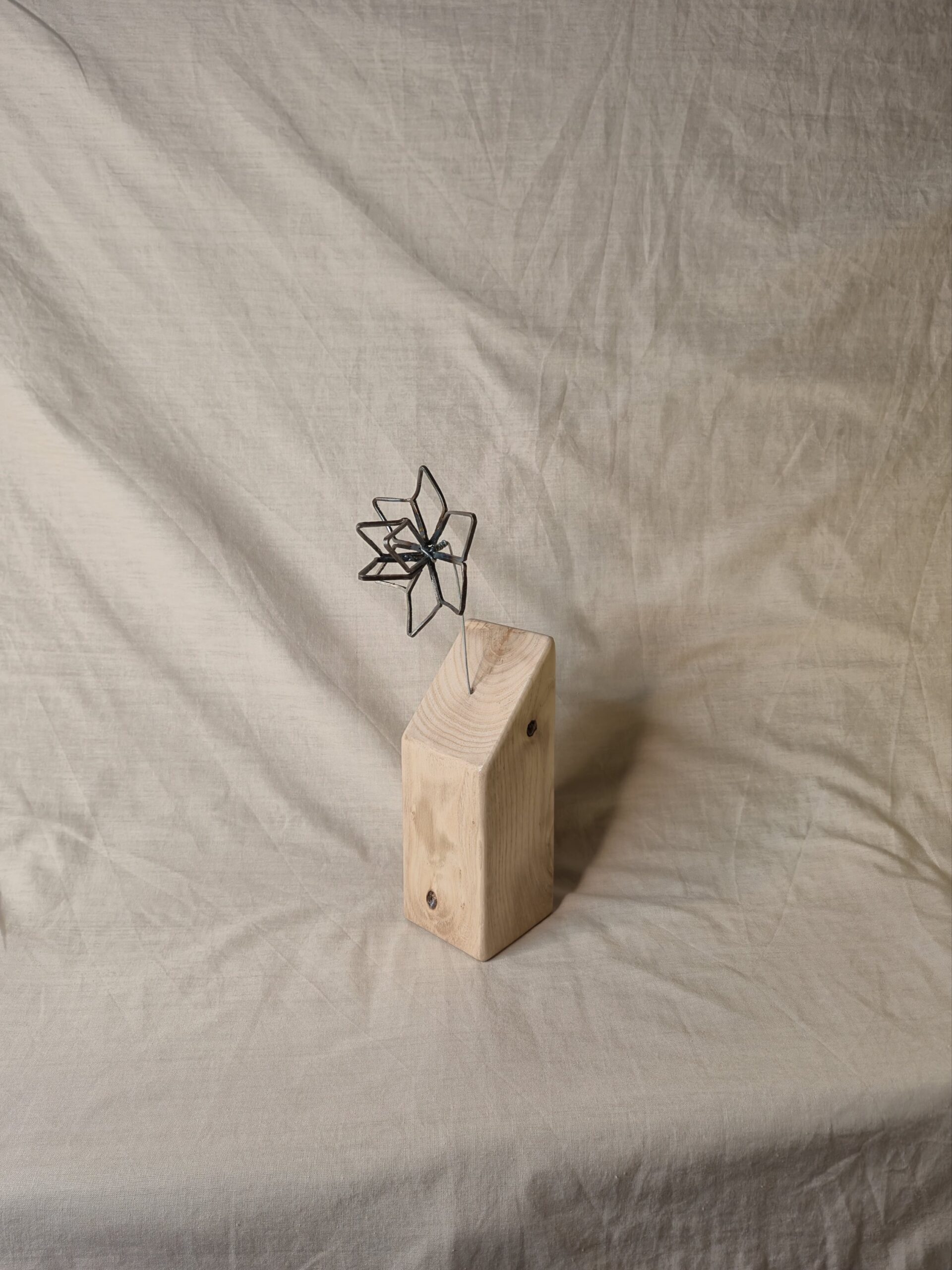 La fleur en métal est façonnée et soudée manuellement, chaque pétale étant formé un à un, ce qui rend chaque pièce unique. Elle est montée sur un socle en bois de châtaignier, sélectionné et sculpté pour révéler la beauté de son veinage naturel et ses imperfections, témoins de la matière brute.