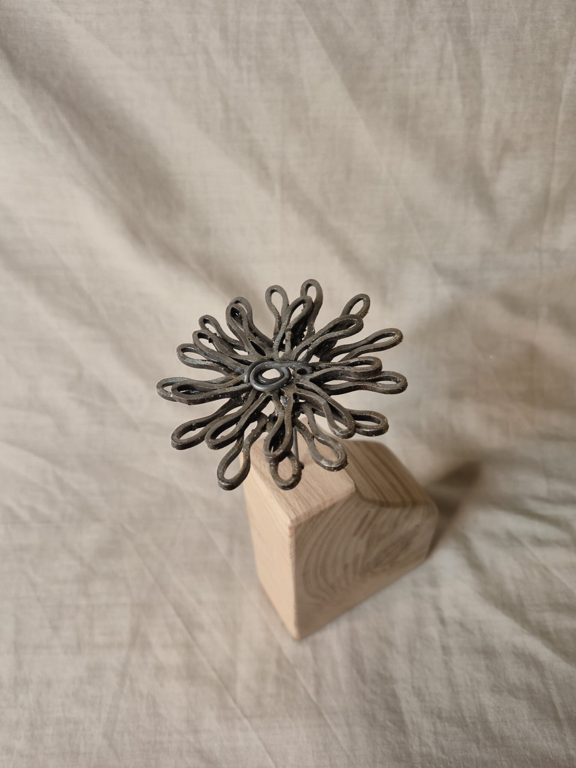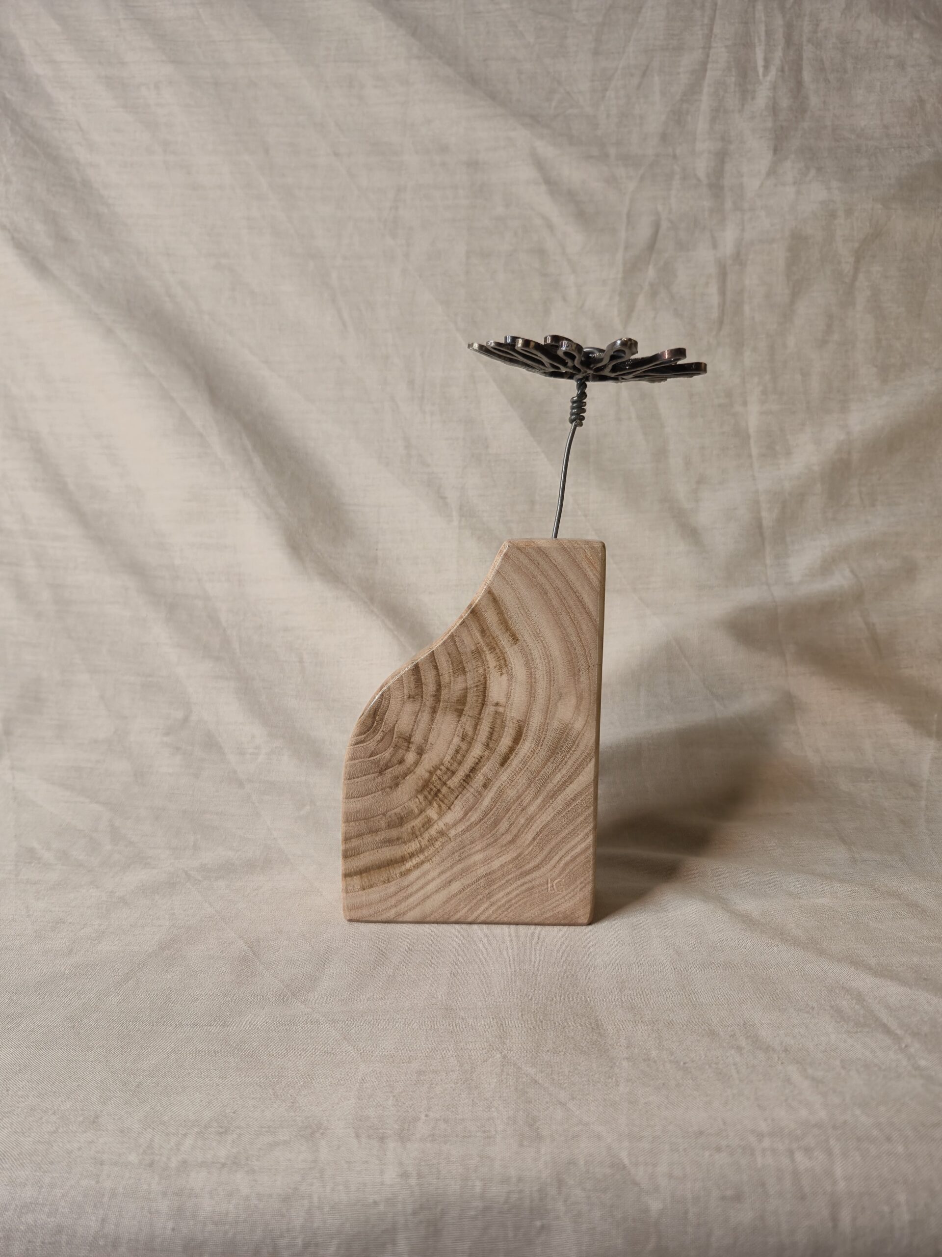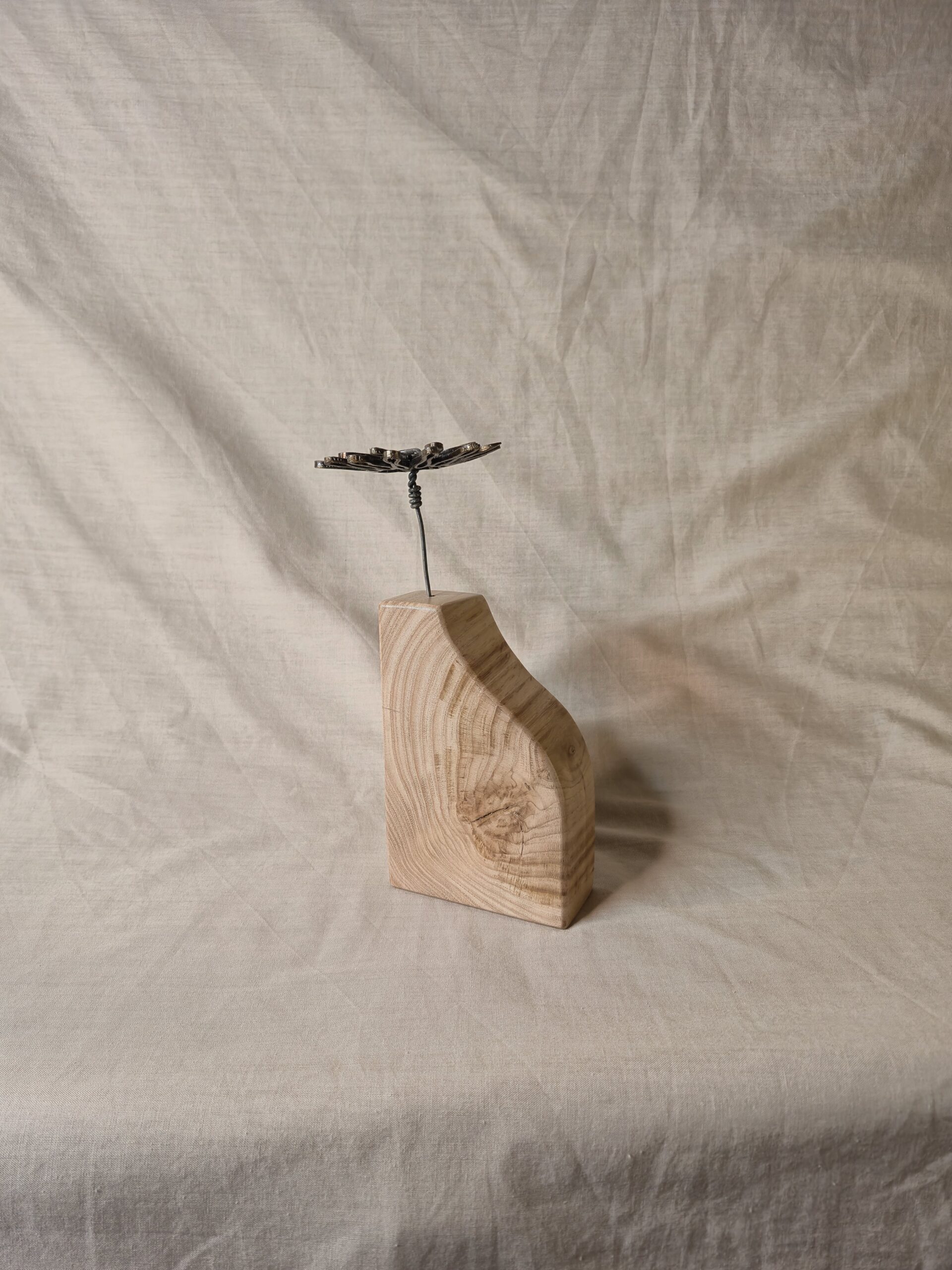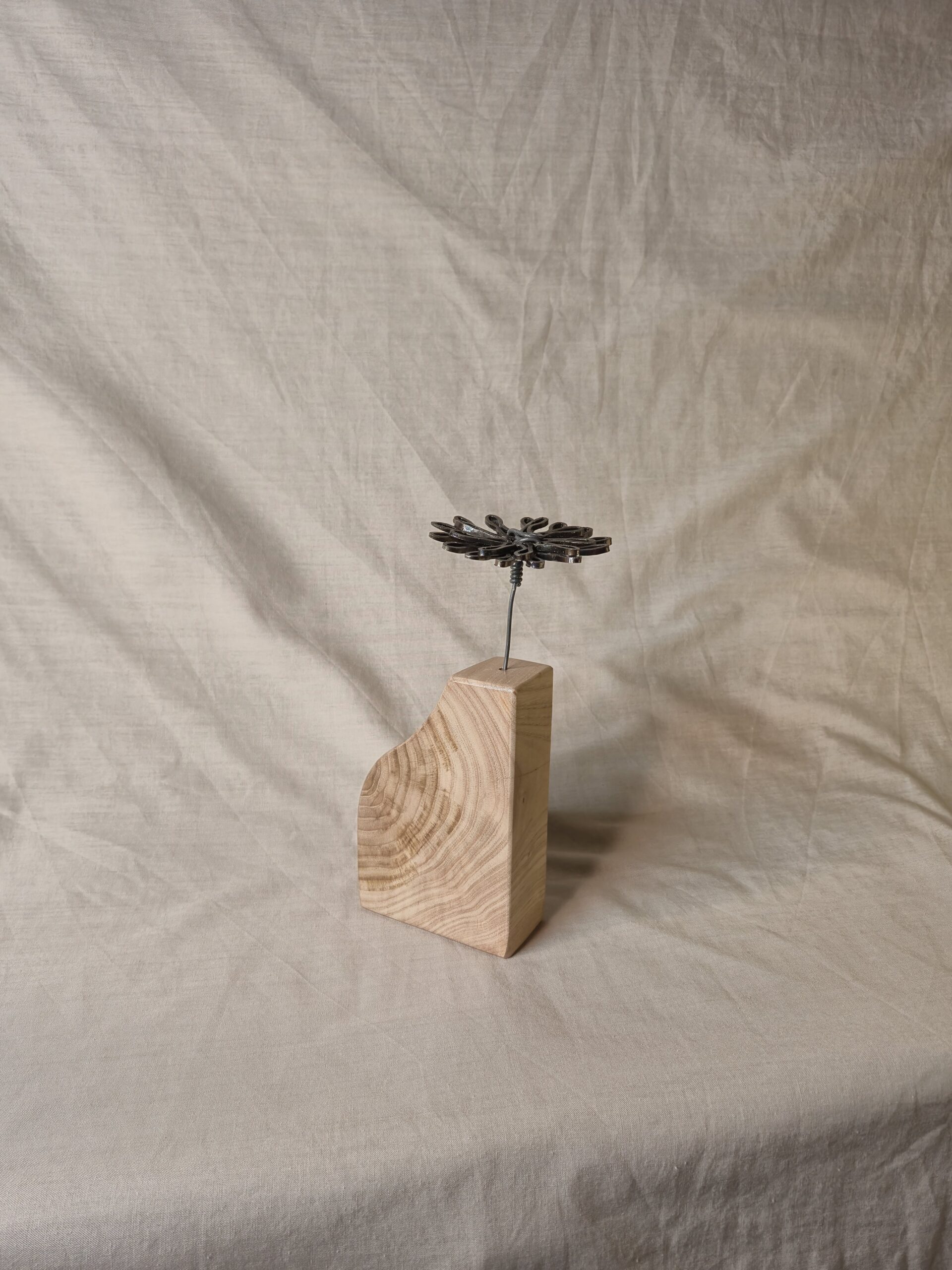 La fleur en métal est façonnée et soudée manuellement, chaque pétale étant formé un à un, ce qui rend chaque pièce unique. Elle est montée sur un socle en bois de châtaignier, sélectionné et sculpté pour révéler la beauté de son veinage naturel et ses imperfections, témoins de la matière brute.